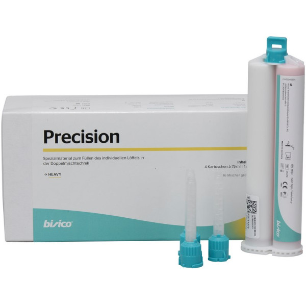 Universell einsetzbares, zähfließendes Abformmaterial von absoluter Präzision in der 75 ml Kartusche. Die spezielle Konsistenz und die eingestellte Endhärte ermöglichen den Einsatz von Precision in der Doppelmischtechnik im individuellen Löffel sowie zur Abformung von Teleskop- und Geschiebearbeiten, Implantatabformungen und zur Basiskorrekturabformung in der Totalprothetik. Bisico® Precision ist auch im Triple-Tray für Teilabformungen anwendbar. Packung 4 x 75 ml Doppelkartusche heavy, 16 Mischer grün