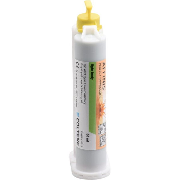 AFFINIS®-Korrekturmaterialien benetzen Zahn und Gingiva äußerst schnell und effektiv. Mit seiner hydrokolloidähnlichen Eigenschaft fließt das Korrekturmaterial ohne Druckeinwirkung selbst in engste Stellen ein.AFFINIS® weist aufgrund der strukturbrechenden Eigenschaften seines Tensidsystems einen sehr niedrigen Kontaktwinkel auf. Das angemischte Material hat eine ausreichende Standfestigkeit und tropft nicht vom Zahn. Nachfüllpackung 20 x 50 ml Doppelkartusche light body