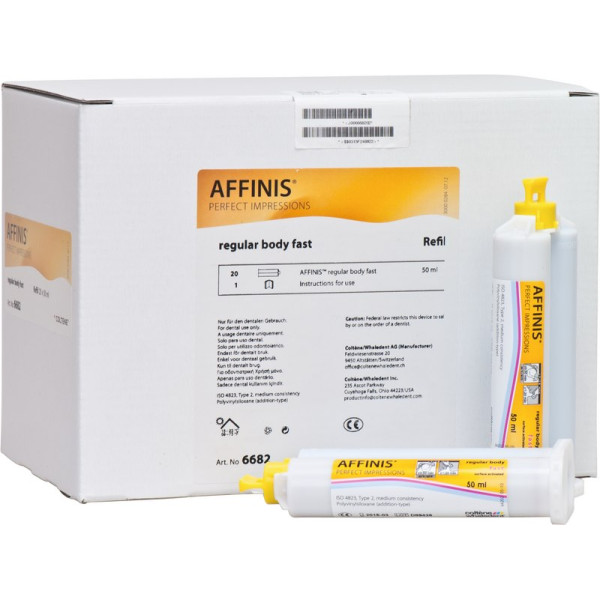 AFFINIS®-Korrekturmaterialien benetzen Zahn und Gingiva äußerst schnell und effektiv. Mit seiner hydrokolloidähnlichen Eigenschaft fließt das Korrekturmaterial ohne Druckeinwirkung selbst in engste Stellen ein.AFFINIS® weist aufgrund der strukturbrechenden Eigenschaften seines Tensidsystems einen sehr niedrigen Kontaktwinkel auf. Das angemischte Material hat eine ausreichende Standfestigkeit und tropft nicht vom Zahn. Nachfüllpackung 20 x 50 ml Doppelkartusche fast regular body