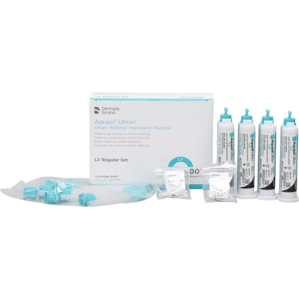 Aquasil® Ultra+ ist ein A-Silikon Abformmaterial welches für alle Abformtechniken geeignet ist. Neuste Entwicklungen sorgen dafür, dass die klinische Leistungsfähigkeit auf allen Gebieten optimiert wurde. Verbesserte Hydrophilie für höhere Präzision als je zuvor Verbesserte Reißfähigkeit für mehr Sicherheit Verschiedene Optionen bei Abbindezeiten und Applikation für bessere klinische Resultate Nachfüllpackung 4 x 50 ml Doppelkartusche LV Regular Set, 12 Mischkanülen, 12 Intraoral-Tips