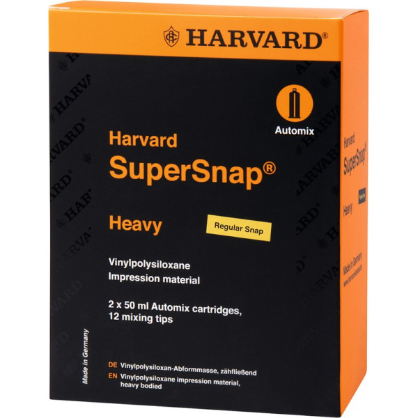 Harvard SuperSnap® sind die neuen Vinylpolysiloxan Abformmassen. In Harvard SuperSnap® sind herkömmliche Verarbeitungszeiten kombiniert mit einer Mundverweildauer von nur 75 Sekunden (in der „Quick“ Variante). Die Vorteile für den Behandler sind eine höhere Abformgenauigkeit und Zeitersparnis. Durch die vielen kontrastreichen Farben bietet Harvard SuperSnap® obendrein eine perfekte Lesbarkeit. Die sehr kurze Mundverweildauer erhöht gerade für empfindliche Patienten den Behandlungskomfort. Kurze Mundverweildauer in der Quick Snap Variante 75 Sekunden Überaus patienten- und anwenderfreundlich Entspanntes Arbeiten Exzellente Fließeigenschaften Exakte Zeichnungsschärfe Farbintensiv für eine perfekte Lesbarkeit Stark ausgeprägte Hydrophilie für beste Ergebnisse und sehr hohe Genauigkeit Geeignet für die Sandwich- und Putty-Wash Technik Als RegularSnap und QuickSnap Variante verfügbar Packung 2 x 600 g Dose Putty schwarz regular, 2 Löffel