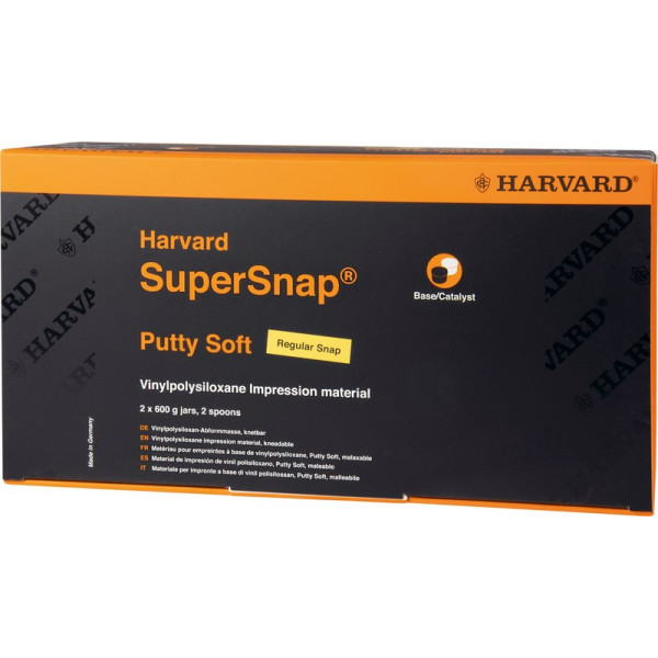 Harvard SuperSnap® sind die neuen Vinylpolysiloxan Abformmassen. In Harvard SuperSnap® sind herkömmliche Verarbeitungszeiten kombiniert mit einer Mundverweildauer von nur 75 Sekunden (in der „Quick“ Variante). Die Vorteile für den Behandler sind eine höhere Abformgenauigkeit und Zeitersparnis. Durch die vielen kontrastreichen Farben bietet Harvard SuperSnap® obendrein eine perfekte Lesbarkeit. Die sehr kurze Mundverweildauer erhöht gerade für empfindliche Patienten den Behandlungskomfort. Kurze Mundverweildauer in der Quick Snap Variante 75 Sekunden Überaus patienten- und anwenderfreundlich Entspanntes Arbeiten Exzellente Fließeigenschaften Exakte Zeichnungsschärfe Farbintensiv für eine perfekte Lesbarkeit Stark ausgeprägte Hydrophilie für beste Ergebnisse und sehr hohe Genauigkeit Geeignet für die Sandwich- und Putty-Wash Technik Als RegularSnap und QuickSnap Variante verfügbar Packung 2 x 600 g Dose Putty Soft schwarz regular, 2 Löffel