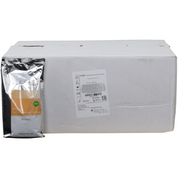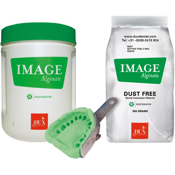 IMAGE Alginat ist staubfrei, sehr glatt, cremig und einfach sowohl per Hand als auch maschinell anzumischen. Die grüne Farbe macht Abdruckdetails einfach zu lesen. IMAGE Alginat hat einen frischen Minzgeschmack und ist 100% biologisch abbaubar und bleibt 4 Tage (100 Stunden) stabil und formfest. NH = 3 Minuten, SH = 2 Minuten. Packung 30 x 500 g Beutel NH