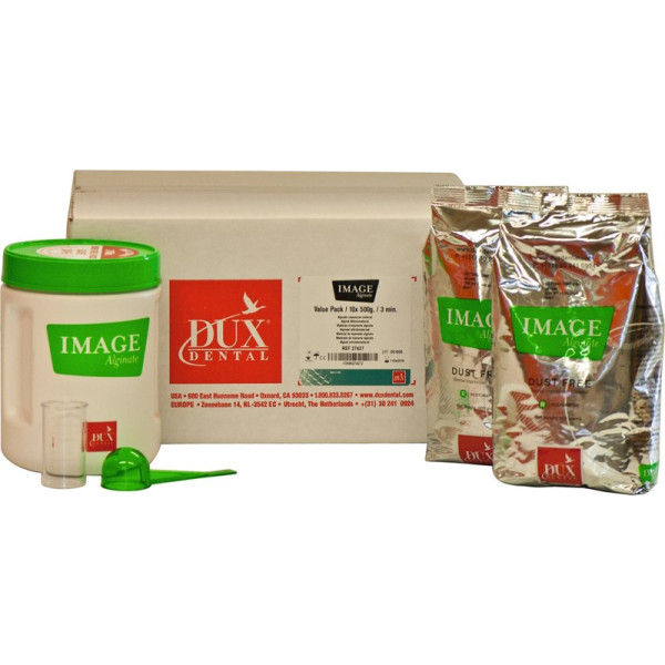 IMAGE Alginat ist staubfrei, sehr glatt, cremig und einfach sowohl per Hand als auch maschinell anzumischen. Die grüne Farbe macht Abdruckdetails einfach zu lesen. IMAGE Alginat hat einen frischen Minzgeschmack und ist 100% biologisch abbaubar und bleibt 4 Tage (100 Stunden) stabil und formfest. NH = 3 Minuten, SH = 2 Minuten. Klinikpackung 10 x 500 g Beutel NH, 1 Behälter, 1 Messbesteck