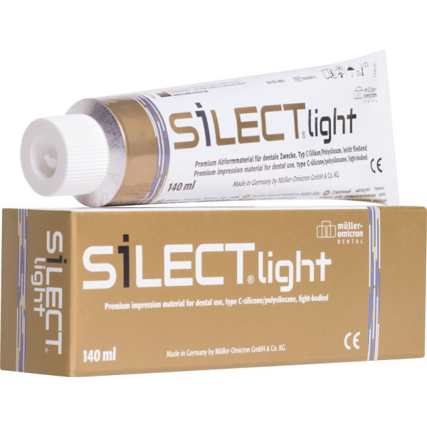 Mit unserer langjährigen Erfahrung und chemischem know-how, sowie der Einsatz modernster Fertigungstechnologien haben wir unser bestes C-Silikon entwickelt – SILECT, Das Premiumabformmaterial bietet hervorragende technische Werte, wie z. B. einen sehr geringen Schrumpf und ein sehr hohes Rückstellvermögen. Aber auch auf die Anwenderfreundlichkeit wurde ein hoher Stellenwert gelegt. Die Konsistenz und kontrastreichen Farben der Materialien sind ideal aufeinander abgestimmt und lassen sich mit dem neuen, gelförmigen, SILECT catalyst einfach und exakt dosieren und leicht anmischen. Die Verarbeitungszeiten sind anwenderfreundlich, die kurze Mundverweildauer patientenfreundlich eingestellt.Verarbeitungszeit bei allen Materialien: 1,30 MinutenMundverweildauer: 3 Minuten Tube 140 ml light