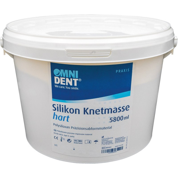 Knetbare, kondensationsvernetzende Silikonmasse mit hoher Abformgenauigkeit für Erst-/Vorabdruck bei der Doppelmischtechnik, Situationsabdruck und Quetschbiss. Optische Anmischkontrolle durch farbigen Tubenhärter. Leicht zu adaptieren. Verbindet sich nicht mit Gips, Wachs, künstlichen Zähnen oder Metall. Abbindezeit ca. 4-5 Minuten. Durch die hohe Endhärte ist eine sichere Fixierung und gute Stabilität der künstlichen Zähne gewährleistet. Normal ca. 60 Shore (A) Hart ca. 70 Shore (A) Eimer 5,8 Liter ohne Härter hart, Shore 60, weiß