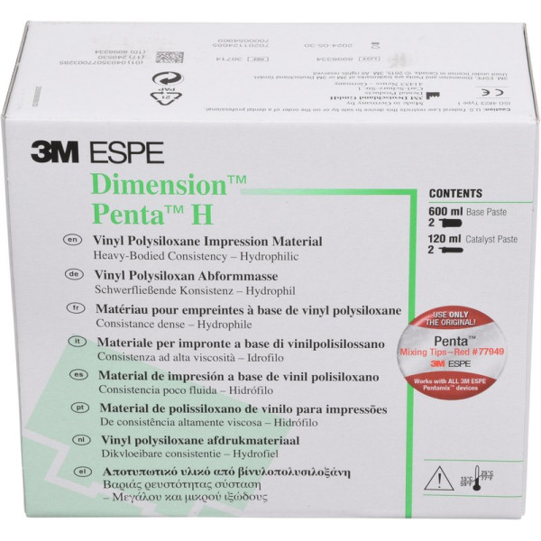 Dimension™ Penta/Garant Präzisionsabformmaterial für die Doppelmischtechnik (feste und dünne Konsistenz) zum automatischen Anmischen und Dosieren im Pentamix System und im Garant Misch- und Applikationssystem.Dimension™ Penta/Garant Quick Präzisionsabformmaterial für die Korrekturtechnik (feste und dünne Konsistenz) zum automatischen Anmischen und Dosieren im Pentamix System und im Garant Misch- und Applikationssystem. Refill Packung 4 x 50 ml Doppelkartusche, 20 Mischkanülen gelb, Garant L Quick