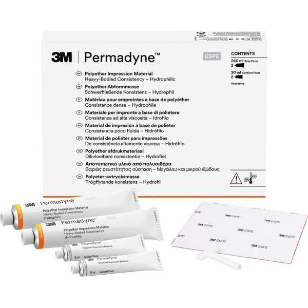 Polyether Präzisionsabformmaterial, feste und dünne Konsistenz für die Doppelmischtechnik (Handmischversion).Kronen- und BrückenabformungenInlay- und OnlayabformungenFunktionsabformungenDünne Konsistenz zum Umspritzen in Kombination mit PermadyneFeste Konsistenz für den Abformlöffel Refill Packung 2 x 120 ml Basispaste, 2 x 15 ml Katalysator, 1 Anmischblock, fest
