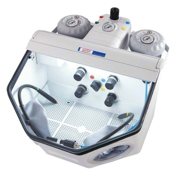 Professionelles Feinstrahlgerät mit 2–4 Strahltanks und der „IS“-Schnellstopptechnik für kontrolliertes Abstrahlen ohne Nachfließen von Strahlmittel. Strahlmittelersparnis von bis zu 80% durch optimales Luft-Sand-Gemisch und der „IS“-Schnellstopptechnik Schnelles und sicheres Arbeiten mit Hilfe einer individuellen Druckeinstellung und –anzeige für jeden Tank Hohe Bewegungsfreiheit in der großvolumigen Strahlkammer (20 l) Einfache, werkzeuglose Tankerweiterung über Schnellkupplungen und Farbleitsystem Präzises Abstrahlen durch optimale Ausleuchtung der Strahlkammer mittel LED-Technik Lang anhaltend gute Sicht auf die Objekte durch silikonisierte Glasscheibe 3 Jahre Garantie Stück Strahlgerät