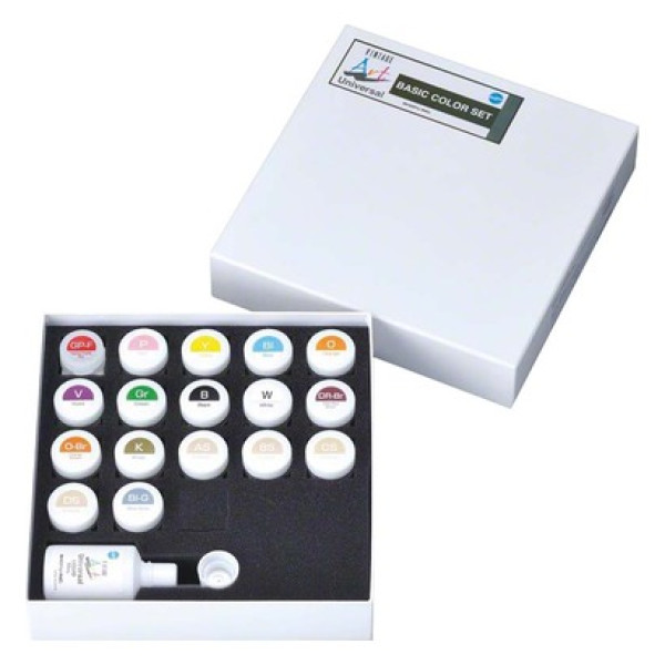 Natürlich wirkende Restaurationen entstehen, wo handwerkliches Geschick und das leidenschaftliche Streben nach Perfektion zusammentreffen. Das intelligente Vintage Art Universal Malfarben- und Glasurkonzept für die 2D- und die 3D-Maltechnik unterstützt diesen hohen Anspruch mit vitalen Farbnuancen auf allen dentalkeramischen Materialien. Mit ihrer mikrofeinen Partikelstruktur und dem erhöhten Glasanteil beeindrucken diese fluoreszierenden Pulvermalfarben und Glasurmassen nicht nur optisch; auch freut sich der Anwender über das angenehme Handling der homogenen Massen und ihre außerordentlich hohe Deckkraft. Zwei unterschiedlich viskose Anmischflüssigkeiten mit unterschiedlichen Lichtbrechungsindizes erweitern das Vintage Art Universal System und schaffen zusätzliche Möglichkeiten – sowohl bei der konventionellen 2D-Maltechnik für Schichtkeramiken wie auch bei der 3D-Maltechnik für monolithische Restaurationen. Basic Color Set 16 x 2 g Malfarben (P, V, Y, Gr, Bl, Bl-G, O, O-Br, DR-Br, W, B, K, AS, BS, CS, DS), 15 g Glasurmasse GP-F, 50 ml Vintage Art Universal Liquid