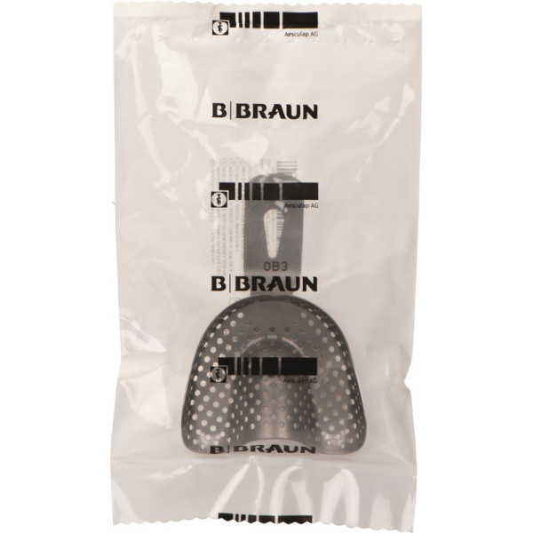 Abdrucklöffel in gelochter Ausführung. Bei Verwendung plastischer bzw. elastischer Abdruckmassen gibt das Durchdringen der Materialien durch die Löffel den erforderlichen Halt für einen guten Abdruck. Die Abdrucklöffel bestehen aus nichtrostendem 18/8 Stahl.UB=bezahnter UnterkieferUU=unbezahnter UnterkieferUP=partiell bezahnter UnterkieferOB=bezahnter OberkieferOU=unbezahnter OberkieferOP=partiell bezahnter Oberkiefer Stück Abdrucklöffel OK Größe OB3