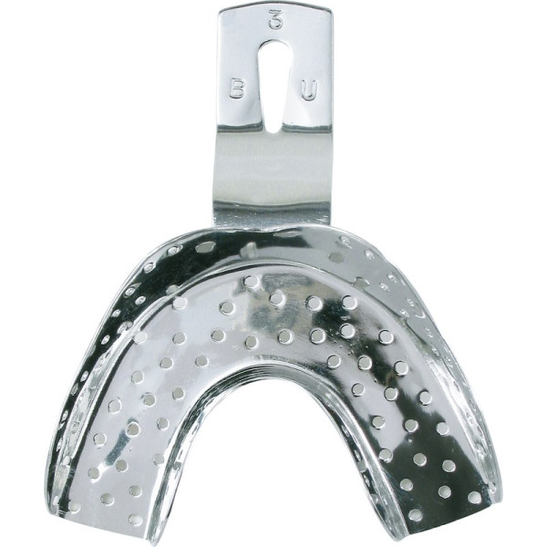Je 5 Formen für Ober- (BO 0-4) und Unterkiefer (BU 0-4). Stabiles und verwindungssteifes Edelstahlmaterial. Gelocht - für perfekten Halt des Abdruckmaterials. Gerundete Kanten sorgen für eine atraumatische Abformung. Elektropoliert - garantiert höchstmögliche Korrosionsbeständigkeit. Geeignet für Autoklav, Thermodesinfektion und Ultraschallreinigung (die Richtlinien des Herstellers sind genau zu beachten). Stück Abdrucklöffel UK Größe BU/3
