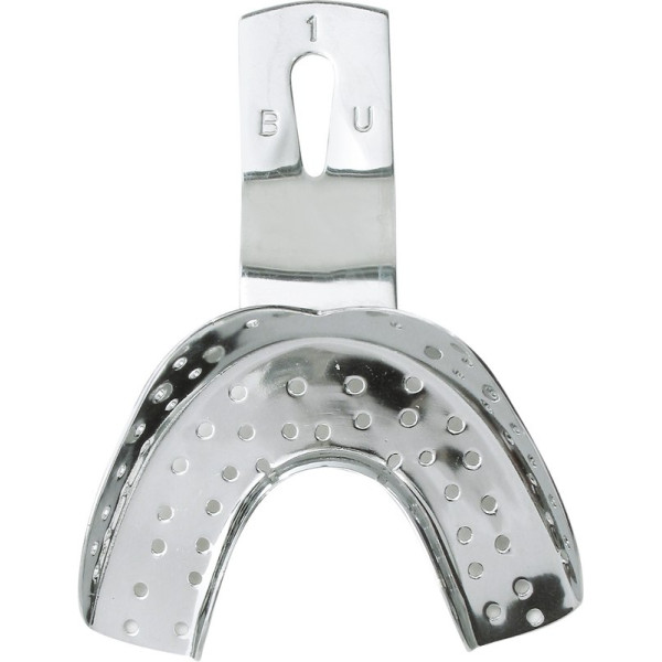 Je 5 Formen für Ober- (BO 0-4) und Unterkiefer (BU 0-4). Stabiles und verwindungssteifes Edelstahlmaterial. Gelocht - für perfekten Halt des Abdruckmaterials. Gerundete Kanten sorgen für eine atraumatische Abformung. Elektropoliert - garantiert höchstmögliche Korrosionsbeständigkeit. Geeignet für Autoklav, Thermodesinfektion und Ultraschallreinigung (die Richtlinien des Herstellers sind genau zu beachten). Stück Abdrucklöffel UK Größe BU/1