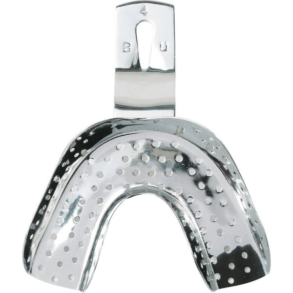 Je 5 Formen für Ober- (BO 0-4) und Unterkiefer (BU 0-4). Stabiles und verwindungssteifes Edelstahlmaterial. Gelocht - für perfekten Halt des Abdruckmaterials. Gerundete Kanten sorgen für eine atraumatische Abformung. Elektropoliert - garantiert höchstmögliche Korrosionsbeständigkeit. Geeignet für Autoklav, Thermodesinfektion und Ultraschallreinigung (die Richtlinien des Herstellers sind genau zu beachten). Stück Abdrucklöffel UK Größe BU/4