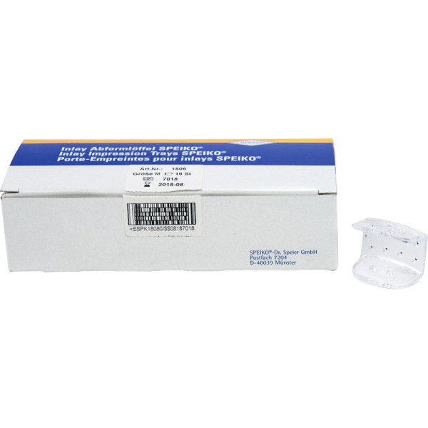 Partielle Abformlöffel aus transparentem, verwindungsfreiem Kunststoff in drei verschiedenen GrößenDie Inlay-Abformlöffel sind konzipiert für die Abformung bei Einzelpräparationen für Gussfüllungen und dergleichenSie sind auch speziell geeignet zur Abformung vor der Fertigung von provisorischen Versorgungen nach PräparationenNicht steril, zur EinmalverwendungKalt desinfizierbar Packung 24 Löffel S, 2,4 cm