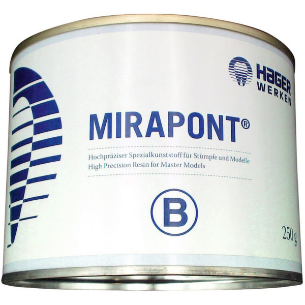 Mirapont® heller, hoch präziser Spezialkunststoff für Stümpfe und Modelle.Sehr dünn und leicht fließendes MaterialBeide Flüssigkeiten (Komponenten A und B, Mischungsverhältnis 1:1) sind in 30 Sekunden angerührtZum Abformen aus Silikon, Alginat, reversiblem Hydrokolloid und ThermoplastNach 90 Minuten wird entfernt, gesägt, beschliffenTotalaushärtung: 2 Stunden, mittel - 70 SHD Dose 250 g Komponente B
