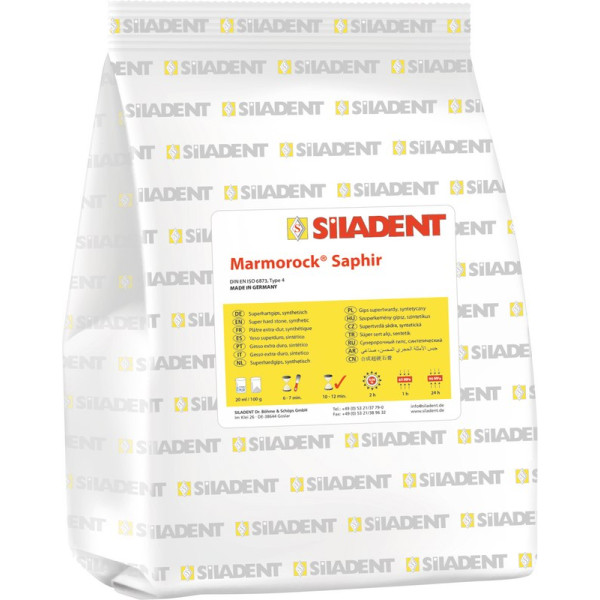 Ein extrem harter Spezialgips mit Snap-Set Effekt (lange Verarbeitungszeit). Aufgrund dessen kann dieser Superhartgips bereits nach 30 Minuten entformt und umgehend weiter verarbeitet werden. Marmorock® Saphir zeichnet sich zudem durch ein cremiges Fließverhalten bei hoher Thixotropie und niedriger Expansion aus. Die außergewöhnlichen Farben sind aufgrund spezieller Compounds scanfähig, absolut homogen und schlierenfrei.Anwendungsempfehlung: Stumpfmodelle, Zahnkränze, Sägeschnittmodelle, Meistermodelle in EM/NEM und VMK-Technik, Kontrollmodelle.Farbe: elfenbein, goldbraun, lichtgrau, maisgelb, superweiß Beutel 5 kg Gips goldbraun