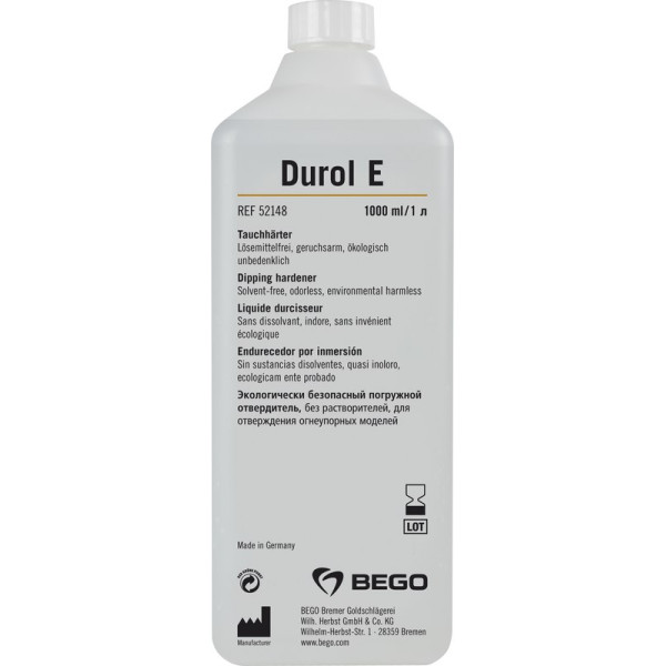 Der Ökotauchhärter Durol E ist frei von Lösungsmitteln und somit biologisch völlig unbedenklich. Beim Trocknen wird kaum Geruch entwickelt, da kein Lösungsmittel vorhanden ist. Verunreinigungen können mit Wasser entfernt werden. 25% Zeit- und Energieeinsparung, da 150 °C Trockentemperatur der Dublikatmodelle genügen. Flasche 1 Liter Tauchhärter