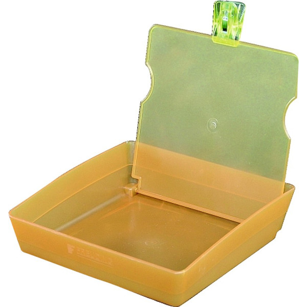 Organisationstalente gesucht? Die neuen Arbeitsschalen von Freuding bringen Farbe in Ihr Labor!Moderne Arbeitsschalen in sechs transluzenten Farben aus schlagfestem ABS-Material für die farborientierte Organisation von zahntechnischen Arbeiten. Sie sind stapelbar, platzsparend und ausgerüstet mit einer auswechselbaren Schwenkklappe die sich arretieren lässt. Eine Klammer in passender Farbe ist inklusive. Größe: 20,3 x 20,3 x 6 cm, aufgeklappt mit Klammer 20,3 x 20,3 x 21,2 cm. Stück Arbeitsschale mango