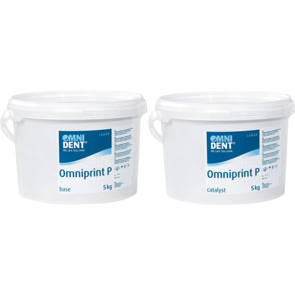 Präzises Dentalabformmaterial auf A-Silikon-Basis für höchste Ansprüche. Die Produkte werden aus ausgesuchten Rohstoffen mittels modernster Fertigungstechnologie in Deutschland hergestellt. Spezielle Füllkörper im Puttymaterial erleichtern das Anmischen und perfektionieren die Homogenität des Mischergebnisses. Omniprint P ist ausschließlich für den zahntechnischen Gebrauch bestimmt. Shore Härte A90. Packung 5 kg Eimer base, 5 kg Eimer catalyst