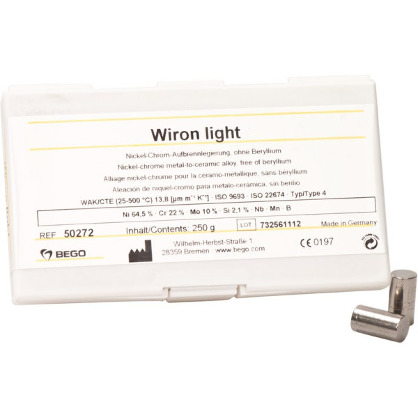 Die edelmetallfreie Legierung für Aufbrennkeramik mit hellem Oxid – berylliumfreiEinfaches Vergießen, leichtes Ausarbeiten, sicheres ArbeitenDie hervorragenden Schmelzeigenschaften gewährleisten ein sicheres Ausfließen der Legierung in die MuffelDas Oxid von Wiron® light ist deutlich heller im Vergleich zu herkömmlichen NiCr-Legierungen und lässt sich sehr einfach und schnell abtragenDurch die abgesenkte Vorwärmtemperatur auf 800 °C wird eine sehr glatte Oberfläche des Gussobjekts erreichtNormale Abkühlung mit einer Vielzahl der Keramiken – für eine zeitsparende, wirtschaftliche VerblendungDer günstige WAK-Wert erlaubt eine sichere keramische VerblendungBiokompatibel und hoch korrosionsbeständig durch eine fest anhaftende Passivschicht, einfaches Vergießen, leichtes Ausarbeiten, sicheres ArbeitenChemische Zusammensetzung: Ni 64,6 · Cr 22,0 · Mo 10,0 · Si 2,1 · B · Mn · Nb Packung 500 g Legierung