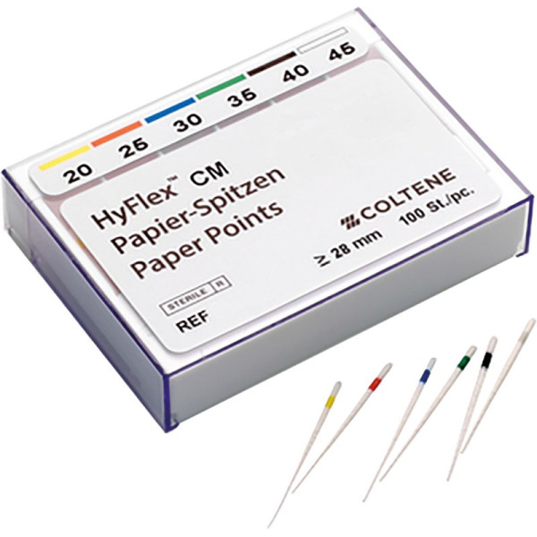 HyFlex CM Papierspitzen sind ideal für die Trocknung von Wurzelkanälen, die mit HyFlex CM Feilen aufbereitet wurden. Am Anfang der Spitze entspricht der Durchmesser den ISO-Grössen, dann folgt der konische Verlauf dem der CM Feilen. Als Einzelgrössen und als Sortierungen lieferbar ≥ 28mm Packung 100 Papierspitzen CM 06, ISO 040