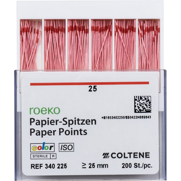 Roeko Papierspitzen werden aus extrem saugstarkem Papier ohne chemische Zusätze und Bindemittel hergestellt. Sie verbinden optimale Festigkeit mit hoher, gleichbleibender Flexibilität und absoluter Maßhaltigkeit. Zur optimalen Trocknung des Wurzelkanals nach exakter Vorbereitung mit genormten ISO-Wurzelkanalinstrumenten. Die Farbcodierung der Roeko Papierspitzen Color verhindert die Verwechslung verschiedener Größen. Beim Kontakt mit Feuchtigkeit erscheint die Farbe der Papierspitze intensiver – eine optimale Kontrolle auf Restfeuchtigkeit im Kanal. Natriumhypochlorit oder Wasserstoffperoxid bleichen die Spitze dagegen aus. Für eine wirtschaftliche, sichere und zeitsparende Behandlung.SterilAbsolut maßhaltig nach ISO-NormAus extrem saugstarkem PapierFrei von BindemittelnHohe gleichbleibende Flexibilität bei optimaler FestigkeitVollautomatische HerstellungLänge: ≥ 25 mm Packung 200 Papierspitzen ISO 025