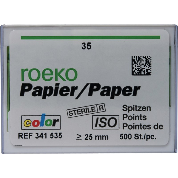 Roeko Papierspitzen werden aus extrem saugstarkem Papier ohne chemische Zusätze und Bindemittel hergestellt. Sie verbinden optimale Festigkeit mit hoher, gleichbleibender Flexibilität und absoluter Maßhaltigkeit. Zur optimalen Trocknung des Wurzelkanals nach exakter Vorbereitung mit genormten ISO-Wurzelkanalinstrumenten. Die Farbcodierung der Roeko Papierspitzen Color verhindert die Verwechslung verschiedener Größen. Beim Kontakt mit Feuchtigkeit erscheint die Farbe der Papierspitze intensiver – eine optimale Kontrolle auf Restfeuchtigkeit im Kanal. Natriumhypochlorit oder Wasserstoffperoxid bleichen die Spitze dagegen aus. Für eine wirtschaftliche, sichere und zeitsparende Behandlung.SterilAbsolut maßhaltig nach ISO-NormAus extrem saugstarkem PapierFrei von BindemittelnHohe gleichbleibende Flexibilität bei optimaler FestigkeitVollautomatische HerstellungLänge: ≥ 25 mm Packung 500 Papierspitzen ISO 035