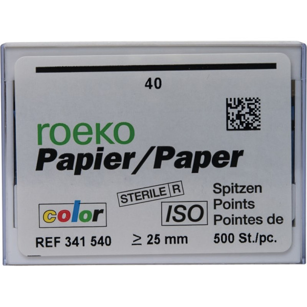 Roeko Papierspitzen werden aus extrem saugstarkem Papier ohne chemische Zusätze und Bindemittel hergestellt. Sie verbinden optimale Festigkeit mit hoher, gleichbleibender Flexibilität und absoluter Maßhaltigkeit. Zur optimalen Trocknung des Wurzelkanals nach exakter Vorbereitung mit genormten ISO-Wurzelkanalinstrumenten. Die Farbcodierung der Roeko Papierspitzen Color verhindert die Verwechslung verschiedener Größen. Beim Kontakt mit Feuchtigkeit erscheint die Farbe der Papierspitze intensiver – eine optimale Kontrolle auf Restfeuchtigkeit im Kanal. Natriumhypochlorit oder Wasserstoffperoxid bleichen die Spitze dagegen aus. Für eine wirtschaftliche, sichere und zeitsparende Behandlung.SterilAbsolut maßhaltig nach ISO-NormAus extrem saugstarkem PapierFrei von BindemittelnHohe gleichbleibende Flexibilität bei optimaler FestigkeitVollautomatische HerstellungLänge: ≥ 25 mm Packung 500 Papierspitzen ISO 040