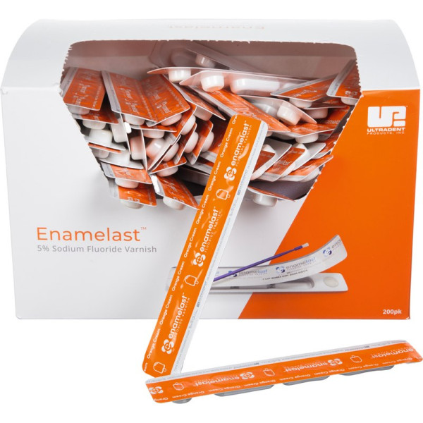Aromatisierter, mit Xylitol gesüßter 5 %iger Natriumfluoridlack mit natürlichen Harzen als Träger. Seine einzigartige Formel sorgt für eine bessere Haftung, was eine hervorragende Fluoridabgabe und -aufnahme ermöglicht. Enamelast® bewirkt einen mechanischen Verschluss der Dentintubuli bei der Behandlung von Zahnhypersensibilität. Die AAPD empfiehlt Fluoridlack für die Anwendung als präventives Hilfsmittel zur Reduzierung des Kariesrisikos. Packung 200 x 0,4 ml Unit Dose Orange Cream
