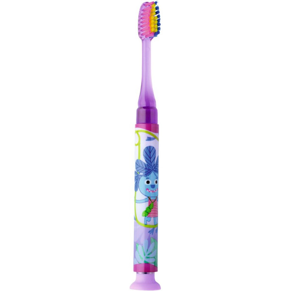 Buntes Monster-Blinklicht für eine Minute hilft den Kindern länger zu putzen! Weiche Borsten für eine sanfte und sichere Reinigung Dome-Trim Schnitt für zuverlässige Plaque-Entfernung Kleiner Bürstenkopf angepasst an das Alter des Kindes Praktischer Saugnapf Die Zahnbürste gibt es in 4 verschiedenen Farben: blau, pink, rot, gelb. Einzelne Farben sind nicht frei wählbar. Stück Zahnbürste für 7-9 Jahre