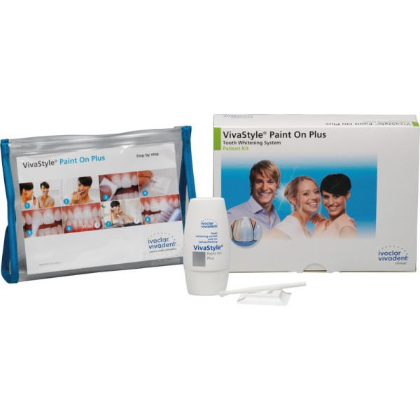 VivaStyle® Paint On Plus, das Lacksystem zum Aufhellen der Zähne in der Praxis und zu Hause. VivaStyle® Paint On Plus mit 6% Wasserstoffperoxid wird mit dem Pinsel direkt auf die Zähne appliziert. Das Lacksystem löst sich nicht im Speichel und entfaltet innerhalb weniger Minuten seine Wirkung. Es können sowohl einzelne Zähne als auch die ganze Zahnreihe aufgehellt werden. In der Zahnarztpraxis kann VivaStyle® Paint On Plus durch mehrfaches Applizieren in einer Sitzung zur Intensivbehandlung eingesetzt werden. Set 20 ml Standtube, 14 Applikationspinsel, 14 Portionierungsschälchen, 1 Tasche