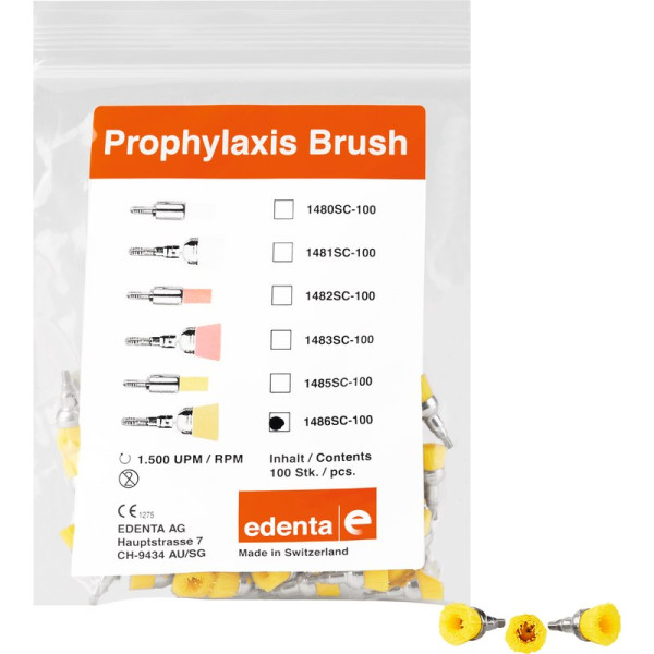 Nylon-Bürsten mit Schraubgewinde zur Beseitigung von Zahnbelägen, mit Polierpaste. Zum Einschrauben in alle bekannten Prophylaxe-Winkelstücke oder in das wiederverwendbare Schraub-Mandrell 4039RA. Großer Kelch - Zur Großflächigen Politur in Front- und Seitenzahnbereichen. Kleiner Kelch - Zur Politur von Front- / und Zahnhals-Bereichen sowie von okklusalen Reliefs in Seitenzahnbereichen. Packung 100 Bürsten gelb ISO 060