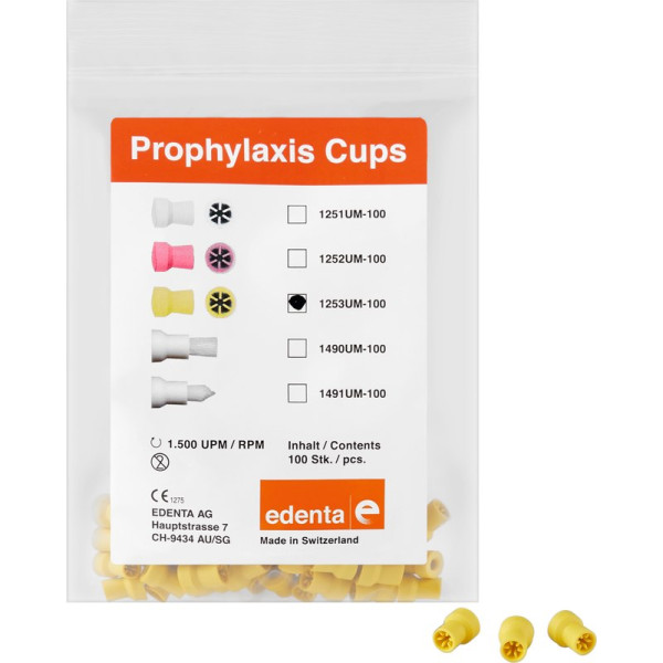 Snap-On Polierer mit Spritzschutz, ohne Abrasivstoffe zur Beseitigung von Zahnbelägen, mit Polierpaste. In Verwendung mit dem wiederverwendbarem Snap-On Mandrell 4037RA. Optimale Drehzahl 1.500 U/min.Cup weiß - Standard Polierer, zum Entfernen von Zahnbelag und zum Polieren. Cup rosa - Weicher Polierer, zum Entfernen von Zahnbelag in Sulkusnähe, zur Schonung des Weichgewebes. Cup gelb - Harter Polierer, zum Entfernen von starkem Zahnbelag und Verfärbungen. Packung 100 Bürsten gelb ISO 060