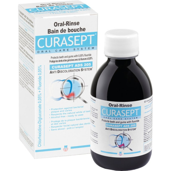 Curasept ADS 205 Mundspülung mit 0,05 % CHX und 0,05 Fluorid. OHNE Alkohol Schützt Zahnfleisch und Zahnschmelz Anti-Discoloration System ideal für Träger von Zahnspangen oder anderen kieferorthopädischen Apparaturen erhöhter Putzerfolg für motorisch eingeschränkte Personen durch das Chlorhexidin (CHX) antibakterielle Wirkung durch CHX Die Curasept ADS 205 Mundspülung schützt das Zahnfleisch und Zahnschmelz zuverlässig. Es hat eine antibeschichtende und remineralisierende Wirkung und dank des Anti-Discoloration-Systems entstehen keine ungewollten Zahnverfärbungen. Im Gegensatz zu herkömmlichen Mundspülungen auf CHX-Basis ist der Geschmack angenehm und das Geschmacksempfinden wird nicht verändert. Ideal in Verbindung mit Curasept Zahnpasten. Flasche 200 ml Mundspülung