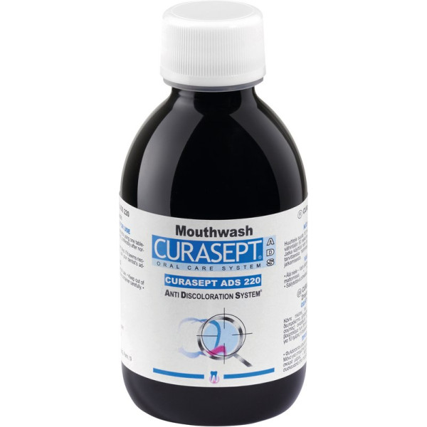 Curasept ADS 220 Mundspülung mit 0,20 % CHX OHNE AlkoholAnti-Discoloration SystemAntibakterielle Wirkungerhöhter Putzerfolg für motorisch eingeschränkte Personen durch das Chlorhexidin (CHX)kurzfristige Anwendung Die Curasept ADS 220 Mundspülung eignet sich ideal vor und nach chirurgischen Eingriffen, zur Vorbeugung von Komplikationen in der Mundhöhle. Dank des hohen Anteils an Chlorhexidin (CHX) ist die antibakterielle Wirkung sehr stark und sollte deshalb nur kurzfristig angewandt werden. Das Anti-Discoloration System vermindert ungewollte Zahnverfärbungen. Ideal in Verbindung mit Curasept Zahnpasten. Flasche 200 ml Mundspülung