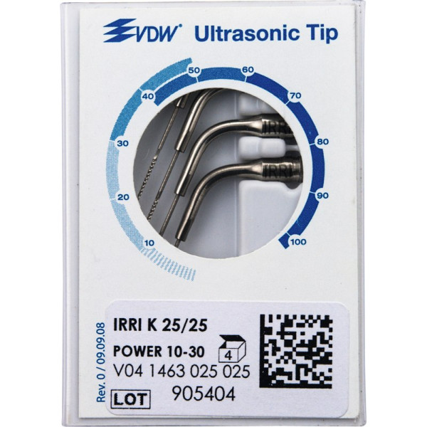 IRRI S – Neuartig für schonende Reinigung: speziell geglättete Feilen zur passiven Spülaktivierung ohne unkontrollierten Substanzabtrag. Vorteil: Sichere Entfernung der Schmierschicht infolge ultraschallgestützter Effekte, wie MikrozirkulationIRRI K – für feine Präparationen graziler Strukturen/Isthmen und für ultraschallgestützte Spülung Packung 4 Feilen K 25/025