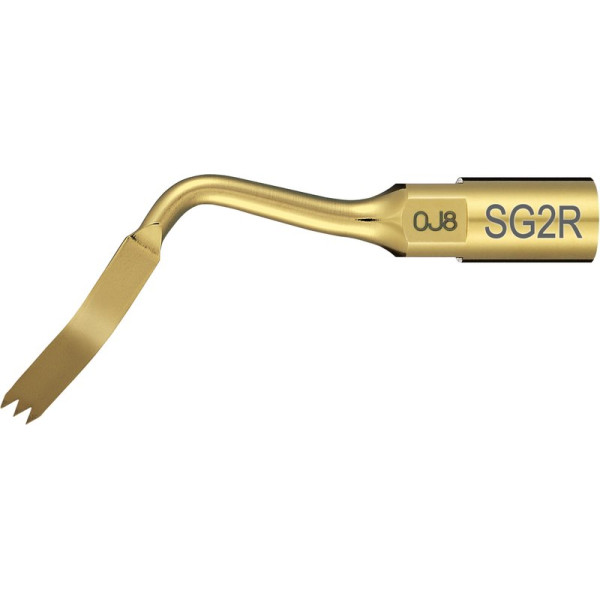 Diese neuen Ultraschall-Aufsätze stellen eine signifikante und wichtige Erleichterung bei der Durchführung von internen Sinusbodenelevationen dar. Sie stehen für minimalinvasive chirurgische Eingriffe und ein Maximum an Sicherheit bei diesem sensiblen Eingriff. Knochenschnitte mittels Ultraschall reduzieren das Perforationsrisiko der Sinusmembran (Schneidersche Membran) und aufgrund der Tatsache, dass Schnitte ohne Osteotom durchgeführt werden, ist der Patientenkomfort erhöht und das Risiko postoperativer Komplikationen – wie zum Beispiel Gleichgewichtsstörungen – reduziert. Stück Schneideansatz SG2R