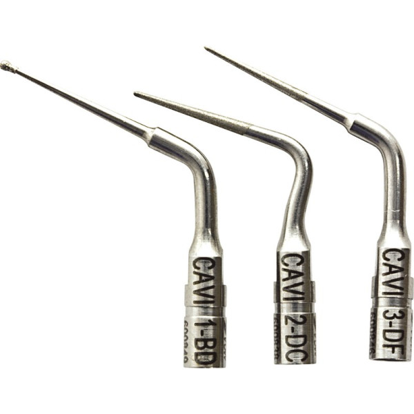 CAVI – diamantierte Aufsätze zur effizienten Feinpräparation in der Zugangskavität und zur Freilegung verdeckter Kanaleingänge. REDO 2 – Feiner Aufsatz aus neuartiger Titan-Niobiumlegierung mit besonderen Eigenschaften für schwierige Revisonsbehandlungen. MAXI-MPR – Robuster Aufsatz zur Entfernung von Metallstiften bei hoher Intensität. Stück Ultraschallspitze REDO 5