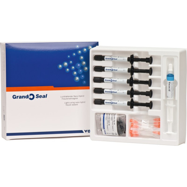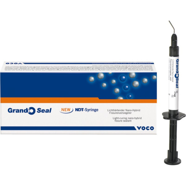 Grandio Seal in der neuen NDT-Spritze. NDT steht für Non-Dripping-Technology. Lichthärtender Nano-Hybrid Fissurenversiegler. Speziell für hochfließfähige Materialien geeignet. Punktgenaue und nachlauffreie Applikation. Kein Materialverlust. Set 5 x 2 g Spritze, 5 ml Vococid Gel, Applikationskanülen Typ 45, Zubehör