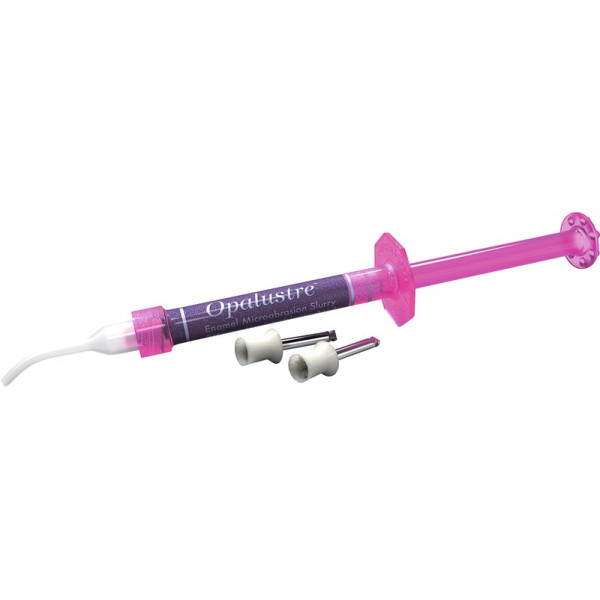 Microabrasionspaste in idealer Viskosität, chemisch und mechanisch wirkend. Opalustre® enthält Siliciumcarbidpartikel und Salzsäure in wasserlöslicher Grundlage. Mit Opalustre® lassen sich unansehnliche Schmelzverfärbungen entfernen, die auf Strukturveränderungen zurückzuführen sind und nicht tiefer als ca. 0,2 mm reichen. Dies sind z. B. weißliche und bräunliche Dekalzifizierungsareale und sowie Fluorose-Flecken. Nach der Behandlung erscheint die Schmelzoberfläche sehr natürlich, wie aprismatischer Schmelz. Auch in Kombination mit Zahnaufhellung einsetzbar. Set 2 x 1,2 ml Spritzen, 10 White Mac Tips, 5 OpalCups mit Bürstchen, 5 Opalcups ohne Bürstchen