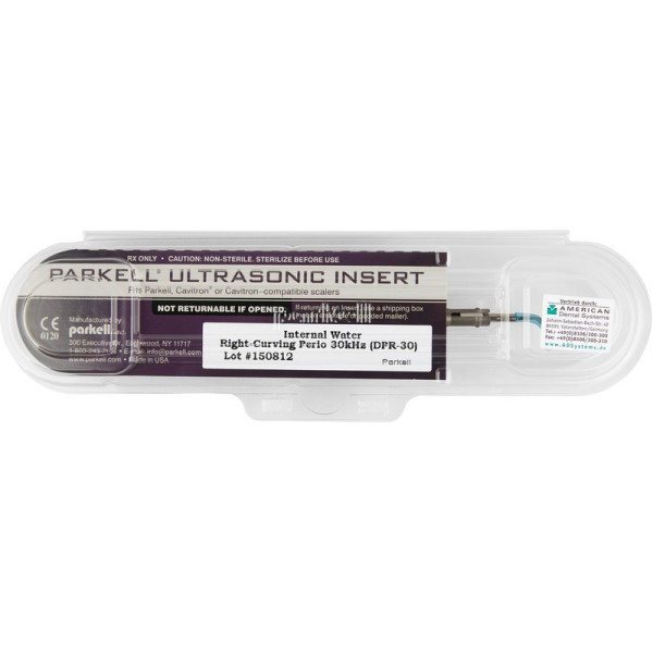 Die Spitzen für die Behandlung der Zähne sind dünner als eine Parodontalsonde und ausgeformt wie eine gebogene Sonde. Diese Enden ermöglichen es, tief in die Tasche vorzudringen und subgingival Plaque und Konkremente zu beseitigen, ohne Schäden auf der Wurzeloberfläche zu erzeugen. Nach wie vor sind sie rechts- und linksgekrümmt erhältlich. Außerdem hat man die Wahl zwischen der Ausführung für Geräte mit 25 und 30 kHz, denn die Scaler sind für alle Lamellensysteme (z. B. Parkell Perio Select oder Cavitron) geeignet. Stück Ansatz DPR30 right-curved