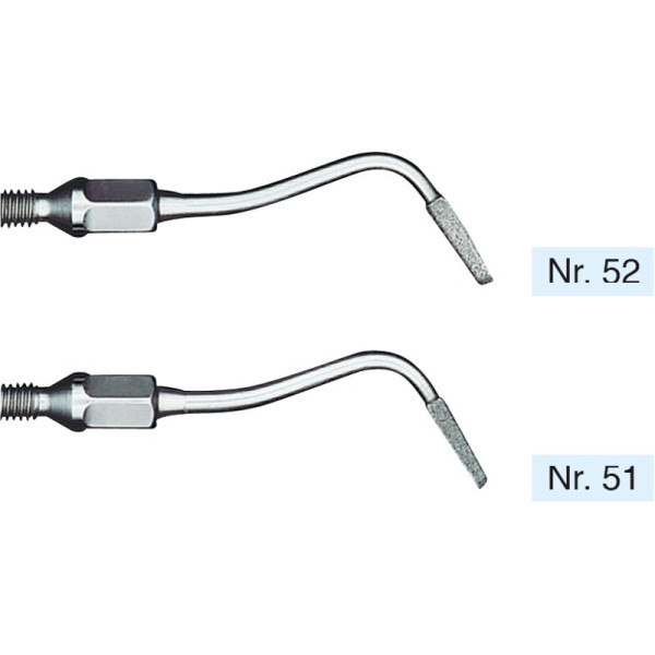 Einseitig diamantierte Spitzen mit definiertem Kantenwinkel von: lateral 30° und cervical 15° nach Dr. Hugo. Wichtiger Hinweis: Alle aufgeführten KaVo SONICflex Spitzen dürfen nur auf KaVo SONICflex 2000 N/L und 2003 L/LX/NX benutzt werden. Für das neue SONICflex 2008 L/LS werden die Spitzen zwar mit der gleichen Hersteller-Nummer, allerdings mit der zusätzlichen Kennzeichnung A verwendet. Stück Spitze mesial Nr. 51A