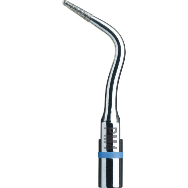 Die Beschichtung der einzelnen Perfect’Margin-Ansätze wurde speziell für jede Arbeitssequenz so konzipiert, dass das Dentingewebe an den schwer zugänglichen Stellen schnell und sicher nachgearbeitet werden kann. Dank ihres Profils können die Ansätze in den Sulkus eindringen, um die subgingivalen Ränder zu optimieren, unter Wahrung des Zahnfleischrandes und des biologischen Raumes. Das erzielte Ergebnis ergibt eine verbesserte Qualität der Präparationsgrenze im Abdruck und somit eine extrem präzise Passung des zervikalen Kronenrandes. Trotz der hohen Leistung (blauer Code) der piezoelektrischen Ultraschallgeneratoren von Satelec erleben Sie mit dem Newtron- Handstück ein völlig neues taktiles Gefühl, das mit herkömmlichen rotierenden Instrumenten unmöglich erzielt werden kann. Die Spitze des Arbeitsteils hat bei diesen instrumenten die Größe ¼ rund. Stück Spitze PM4, konische Spitze mit Diamantierung von 46 μm, angepasst an die koronar-radikuläre Präparation vor dem Setzen des Inlays, Glätten der Eintrittskegel bei anatomisch geformten Stiften