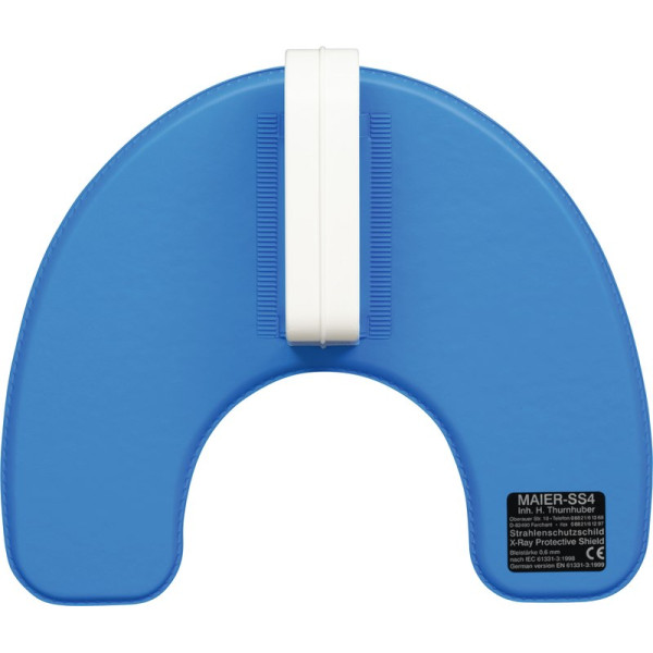 Das Maier-Strahlenschutzschild ist der DIN EN 61331-3 entsprechend gestaltet und mit einer Bleieinlage von 0,6 mm versehen. Es fängt das Nutzstrahlenbündel bei allen intraoralen Röntgenaufnahmen mit Sicherheit auf und wird an einem auswechselbaren Handgriff unter dem Kinn gehalten. Vom Deutschen Institut für Strahlenschutz in München getestet. Stück Schutzschild mittelblau