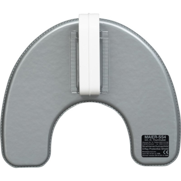 Das Maier-Strahlenschutzschild ist der DIN EN 61331-3 entsprechend gestaltet und mit einer Bleieinlage von 0,6 mm versehen. Es fängt das Nutzstrahlenbündel bei allen intraoralen Röntgenaufnahmen mit Sicherheit auf und wird an einem auswechselbaren Handgriff unter dem Kinn gehalten. Vom Deutschen Institut für Strahlenschutz in München getestet. Stück Schutzschild silber