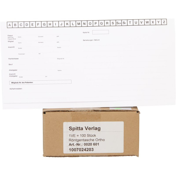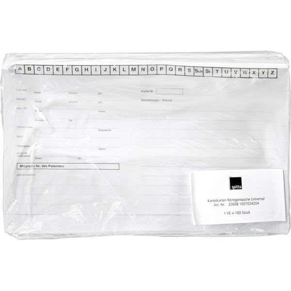 Röntgenaufnahmen wie beispielsweise Zahnfilme, Ortho´s, Panorexaufnahmen, Fernröntgen- oder Handaufnahmen sind in unterschiedlichen Formaten gehalten und lassen sich nicht immer zusammen in einem Archivsystem ablegen. Mit der Röntgenkarteitasche Universal spielen die unterschiedlichen Formate keine Rolle mehr. Diese Röntgenkarteitasche kann alle gängigen Röntgenbilder, die in einer Zahnarztpraxis erstellt werden, gesamt aufnehmen. Mit der Röntgenkarteitasche Universal schaffen Sie ein zentrales Archivsystem für Ihre gesamten Röntgenbilder. Packung 100 Taschen Universal, 182 x 305 mm