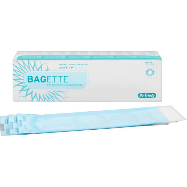 Die aus besonders stabilem Material hergestellten Bagettes haben verstärkte Nähte und einen selbstklebenden Verschluss für einfachstes Handling. Das spezielle, auf die verschiedenen Kassettengrößen abgestimmte Design reduziert Materialverbrauch und Arbeitszeit. Zwei integrierte Indikatorstreifen (innen und außen) zeigen an, dass die erfolgreichen Parameter der Sterilisation erreicht wurden. Packung IMS-1347, 200 Sterilisationstüten, 70 x 229 mm