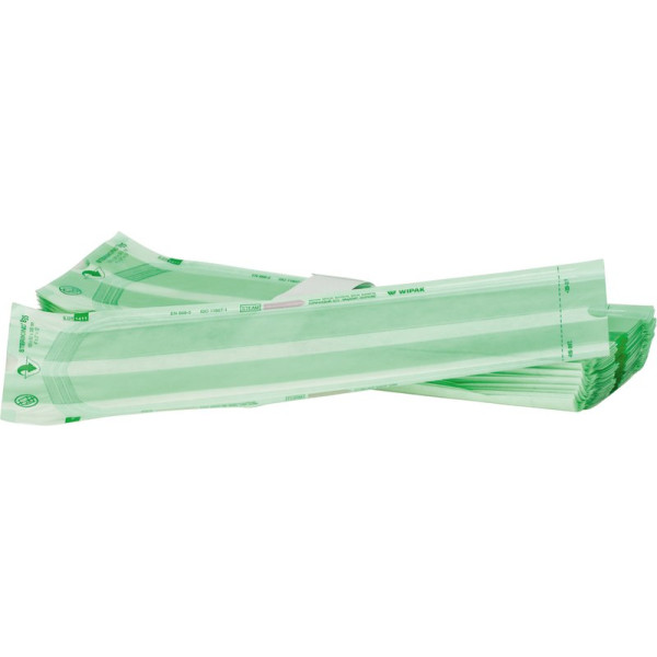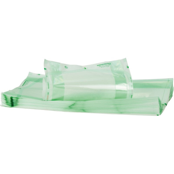 Beutel mit Seitenfalte für größere Gegenstände. Mit aufgedrucktem Prozessindikator für Dampf-, EO- und FO-Sterilisation. Beim Verschließen von Beuteln mit Seitenfalte dürfen an der Siegelkante keine Knitter entstehen. Beim Öffnen von Beuteln mit Seitenfalte muss darauf geachtet werden, dass an den Seitenfalten keine Risse entstehen.