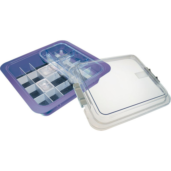 Größe: (B x H x T) 32 x 30 x 10,2 cmVerriegelbare Abdeckhaube (transparent)Bodenmatte (rutschfest)Trennwände (kurz- und adaptierbar)Kleinteilebehälter mit Klarsichtdeckel (klein)Kleinteilebehälter mit Klarsichtdeckel (groß)Schiebetray mit Einteilung (transparent)Verriegelbare Abdeckhaube (transparent) Sortiment 1 Materialwanne neonlila inklusive Zubehör